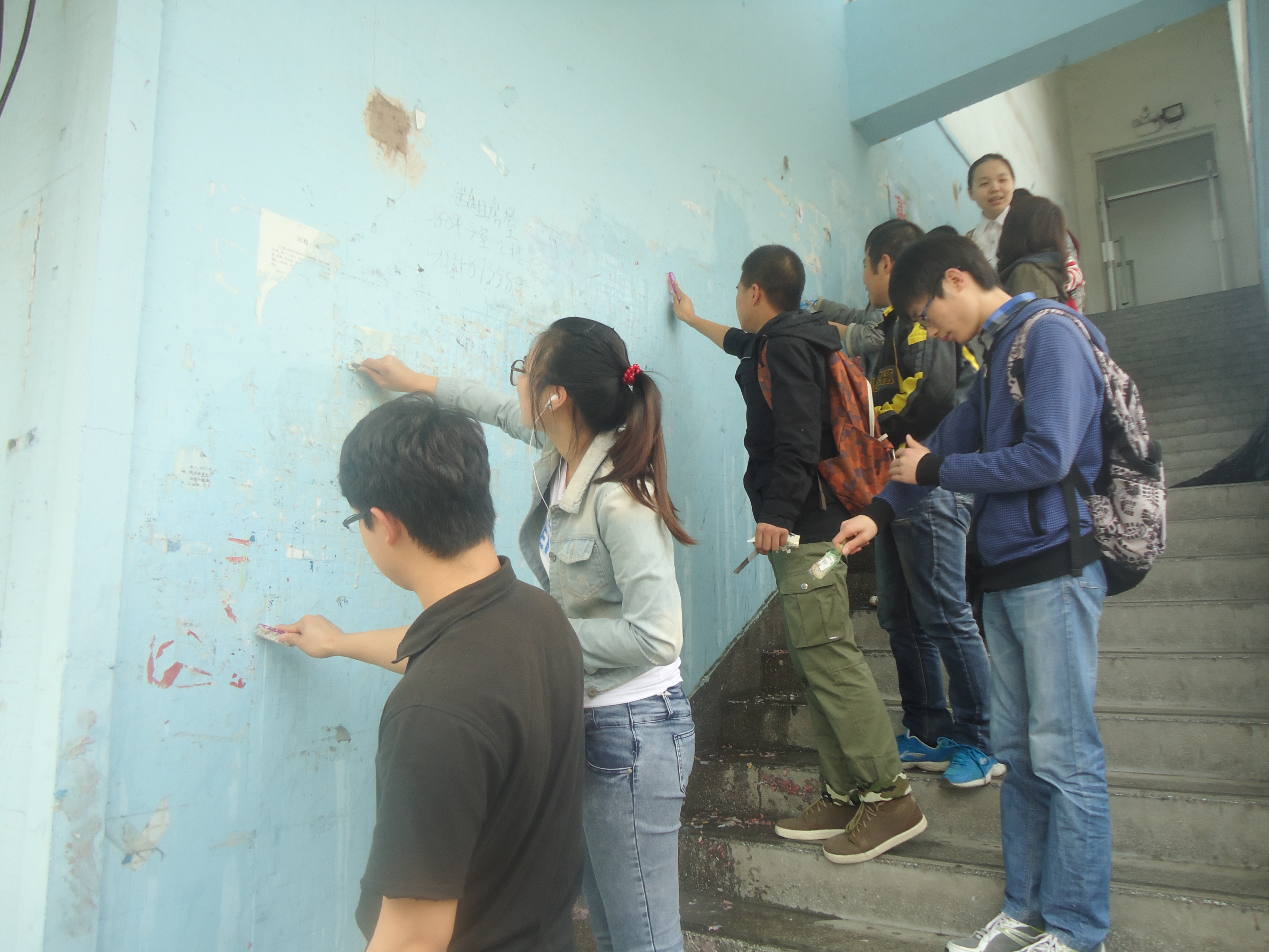 召集志愿者在外语楼集合并由学生干部带队分别到了莘子园,四食堂等区域开始了广告清理,垃圾清扫活动。清理过程中,同学们不怕脏不怕累,认真仔细地清理了四食堂等广告墙上的违章广告,为改善校容校貌做出了重大贡献。最后,同学们还捡拾了校园公路遗留垃圾,铲除树上残留胶带,引得路过老师和同学的称赞。