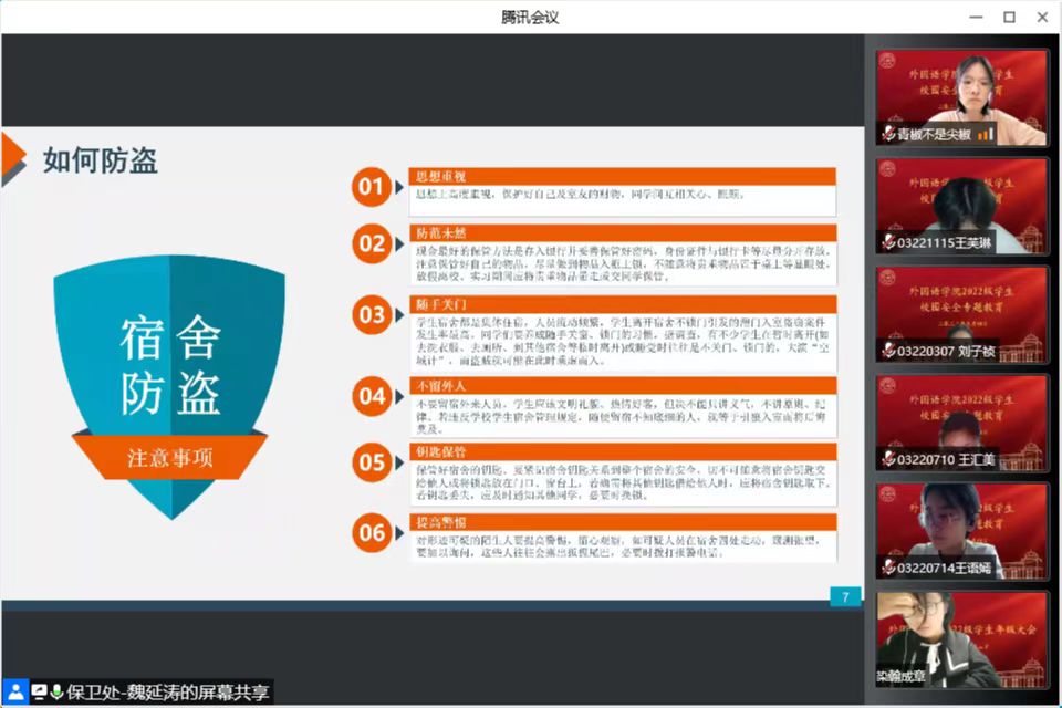 邀请保卫处宣传教育科科长魏延涛老师通过线上方式举行安全教育专题讲座。